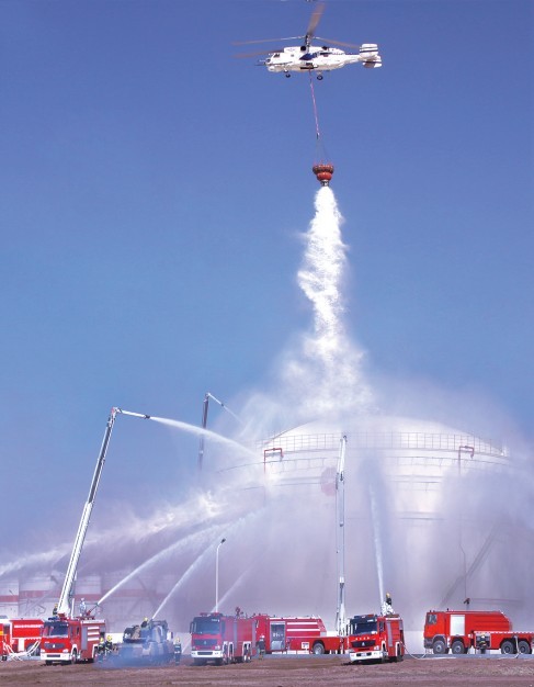 近年来,鄂尔多斯市高度重视消防工作,加大投入配备了大批先进的消防装备,有68米登高消防车、60米高喷消防车、消防直升机等,消防能力得到大幅提升。图为大型石油化工火灾联合扑救演练现场。